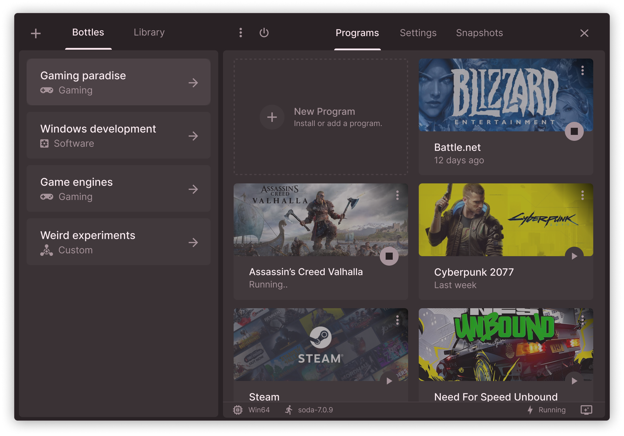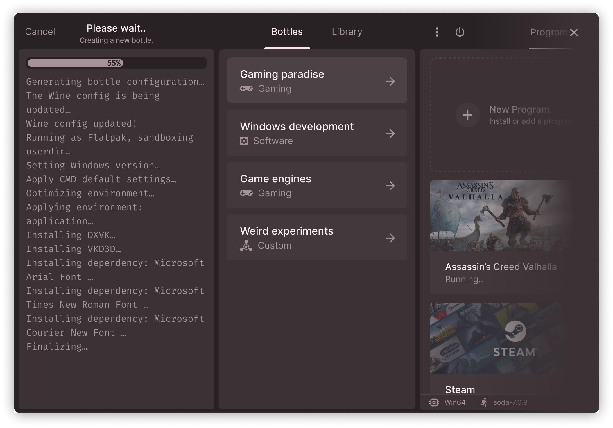 The library was a highlight of 2022 for Bottles, allowing users to add their favorite software from all their bottles for easier access. In Bottles Next, the library plays a crucial role, especially on gaming devices like the Steam Deck.