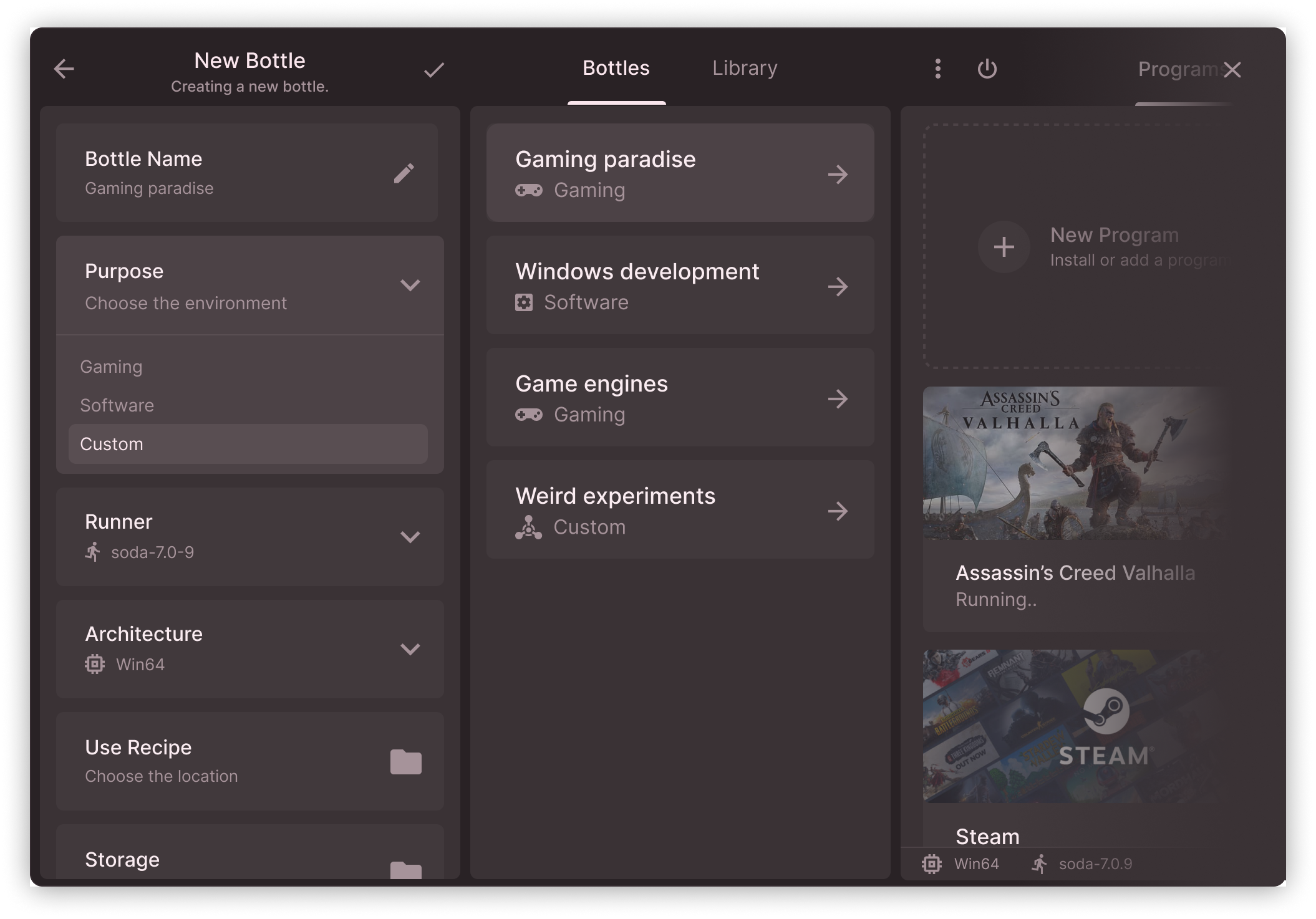 The Classic mode, on the other hand, will provide advanced users with the same bottle management capabilities as before. It will introduce many new features for taking full control of their bottles in different environments (Gaming, Software, Custom, and Next). Users can still create Next-type bottles, incorporating the layering and application-specific configuration concepts.