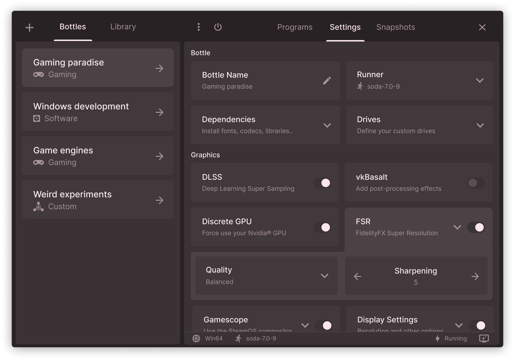 Bottles is a tool for running Windows software on Linux (and MacOS starting with Next), with gaming being the primary use case for most of our user base. For this reason, we’ve decided to provide access to some statistics and useful information for gamers, which can also be appreciated by users running other types of software.