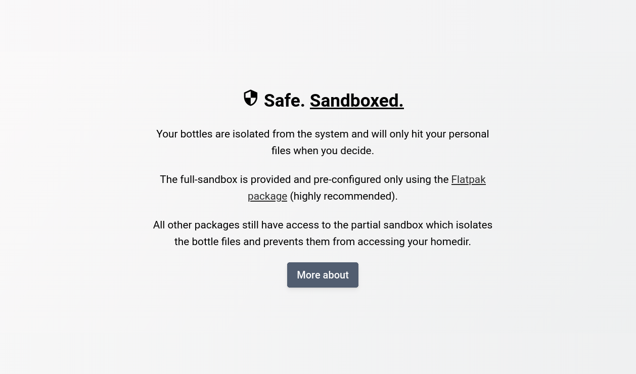 Bottles married Flatpak several months ago now, after a period of adjustment (normal when adopting a new technology or tool), we are officially announcing that Flatpak becomes Bottles’ first distribution format. At the moment it is the most tested package of all and any future updates will be made with particular attention to this format.