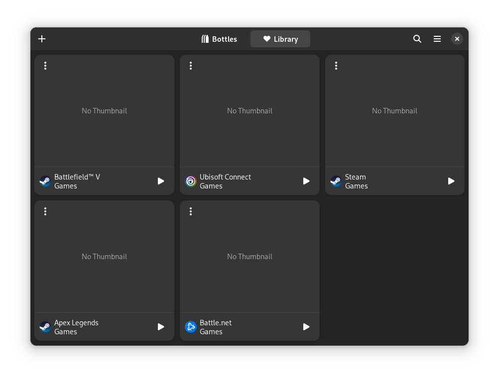 Now the library can be reached from the dedicated tab directly on the main screen of Bottles. We also started the integration with covers, added support for Steam, Epic Games Store and Ubisoft Connect integrations, fixed the icons and cleaned up the design in general to make it more uniform with the libadwaita redesign.