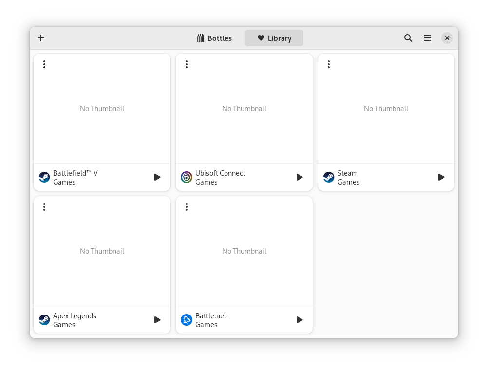 Now the library can be reached from the dedicated tab directly on the main screen of Bottles. We also started the integration with covers, added support for Steam, Epic Games Store and Ubisoft Connect integrations, fixed the icons and cleaned up the design in general to make it more uniform with the libadwaita redesign.