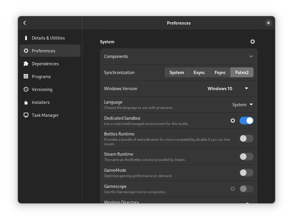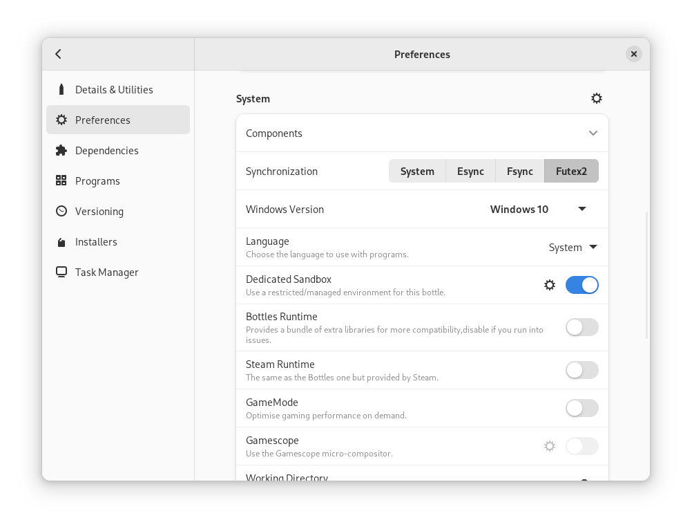 As a result was born Soda, a runner based on Valve’s Wine, with patches from Proton, TKG and GE. This runner is designed and tested for Bottles and is officially supported, giving us the freedom to fix any problems independently.
