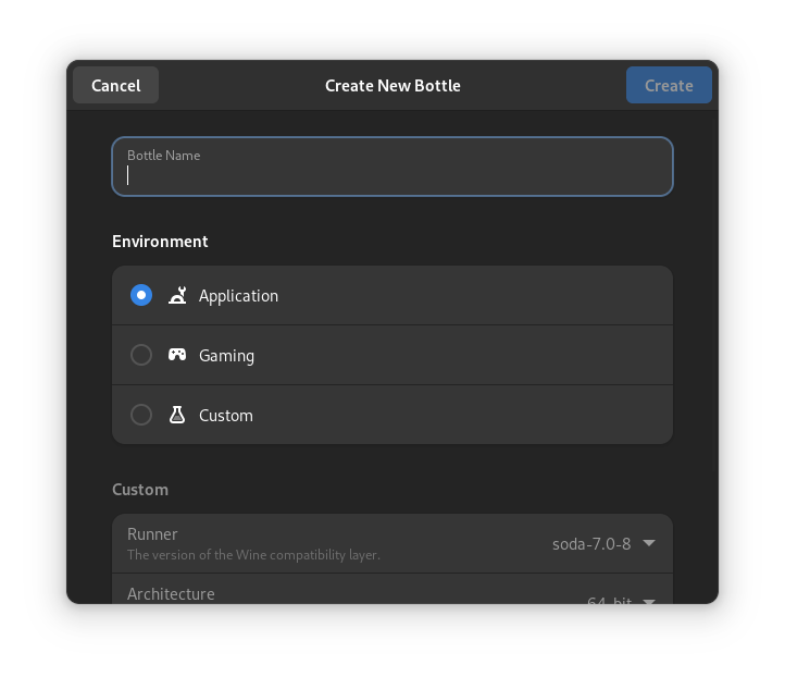 - Runners are now sorted according to a priority list. From the highest to the lowest priority: Soda, Caffe, Vaniglia, Lutris, and then the rest. Whenever you want to create a new bottle, or change the runner of an existing runner, everything will be displayed in order.
